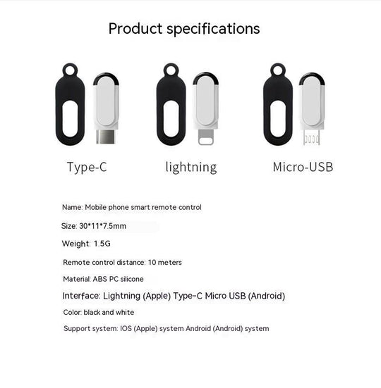 Universal Mobile Remote Keychain – Type-C, Micro-USB, Lightning No reviewsProduct information: Color: Type-c, Android Micro-usb, Apple Lightning Processing Method: patch welding injection molding Screen size: without Display Interface: Type-C/Micro-USB/lightning Material: ABS PC Additional features: charging port dustproof Applicable object: Android OTG Mobile phone Packing List:...Precio regular Desde $ 25.21Precio regular Desde $ 25.21Incl. impuestos: $ 30.00